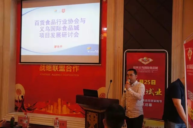 緊接著,桂林市百貨食品行業協會廖會長上臺發言,廖會長總結了全國各地食品百貨行業發展趨勢和自己的從業經驗分享。同時,廖會長結合現在食品百貨行業市場發展趨勢及互聯網的社會潮流,重點闡述了麥得鄰網絡平臺將升級革新現有食品百貨行業的傳統方式。將依托桂林義烏國際食品城平臺和麥得鄰B2B網絡平臺,將桂林義烏國際食品城打造成集線下實體店+網絡訂貨平臺+集中倉儲配送于一體的新型食品百貨批發城。最后,廖會長宣布將對所有進駐義烏國際食品城的VIP財富俱樂部成員開放麥得鄰B2B訂貨平臺,實現食品百貨行業渠道線上線下渠道與物流配送的無縫銜接,實現區域強勢品牌聯盟。