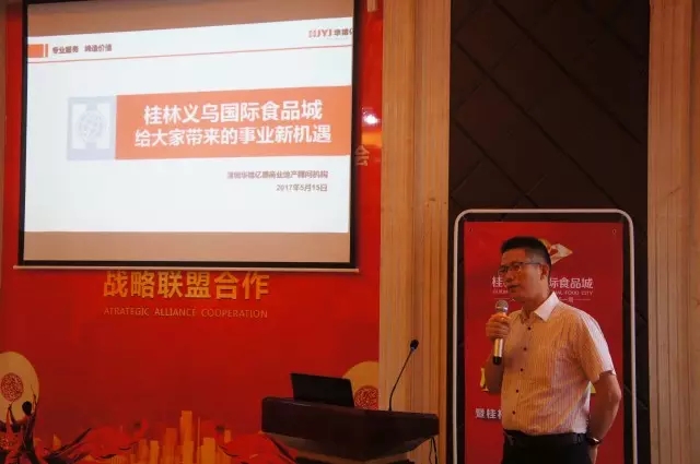 最后,桂林義烏食品城戰略顧問機構深圳華錦億爵商業地產顧問機構謝金杏先生就桂林義烏國際食品城將給大家帶來什么樣的事業新機遇展開發言,謝總分別闡述了食品城的項目定位、桂林食品百貨行業批發市場現狀、項目商業規劃、運營模式、以及項目將給大家帶來什么機遇五個要點展開。重點闡述了作為商家進駐義烏食品城的長期收益。最后謝金杏先生表示在食品城、行業協會、顧問機構、VIP商戶的共同努力下,把桂林義烏國際食品城打造為桂林市顛覆傳統規模最大的食品百貨批發大市場。
