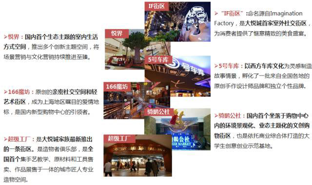 以大悅城為例,在原有商場(chǎng)的基礎(chǔ)上,打造出獨(dú)具特色的“悅界”、“5號(hào)車庫(kù)”“IF街區(qū)”、“魔方166”等特色主題街區(qū),提供多樣化服務(wù)來(lái)制造新的利潤(rùn)增長(zhǎng)點(diǎn)。